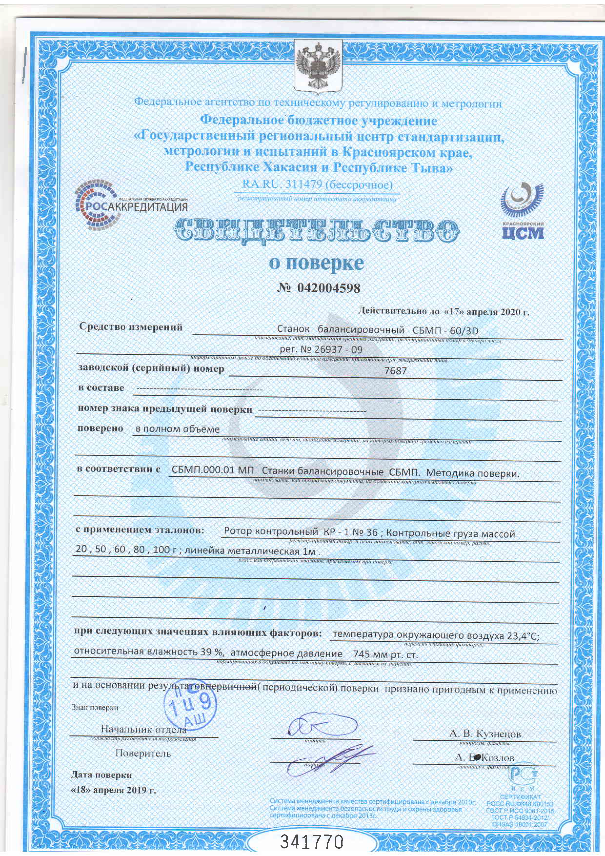Балансировочные станки проходят плановые поверки в Государственном региональном центре стандартизации, метрологии и испытаний на точность показаний измерения. Свидетельство о поверке балансировочных станков от 18 апреля 2019 года.